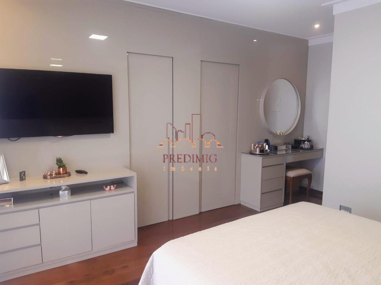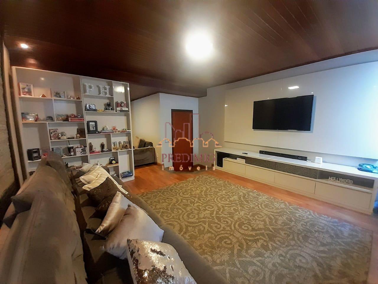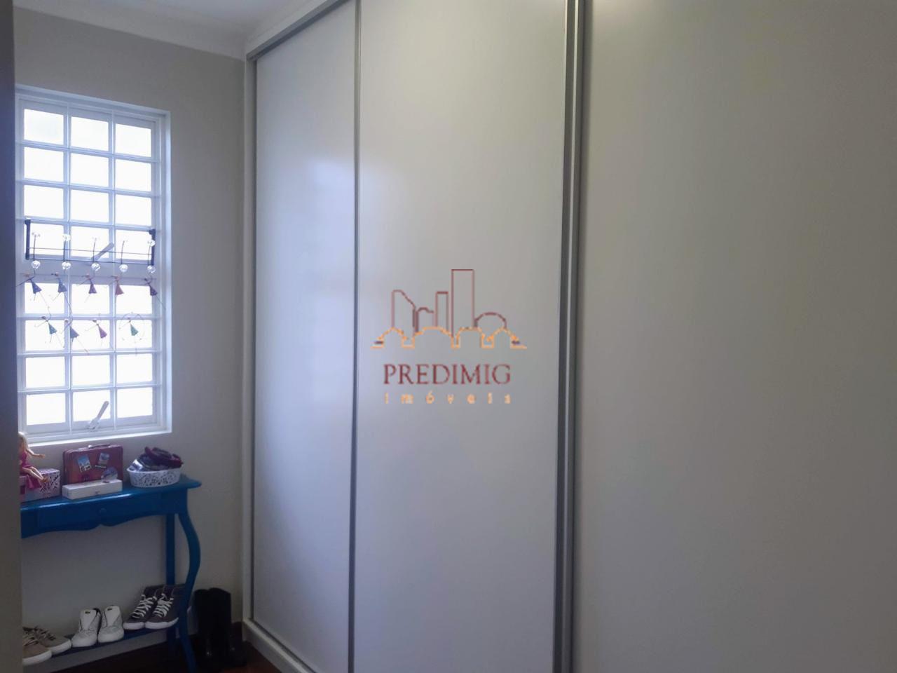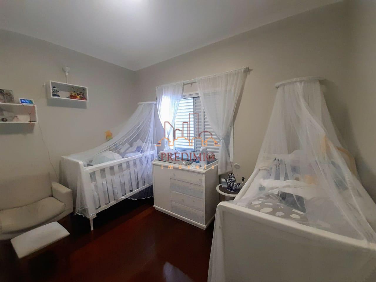 No piso superior, a suíte master conta com closet, varanda e um banheiro com banheira. No piso intermediário, são três quartos com armários, piso em tábua corrida e janelas de esquadria de alumínio. Além disso, há uma sala de cinema, uma sala de TV, um lavabo e um espaço coberto com piso de granito.