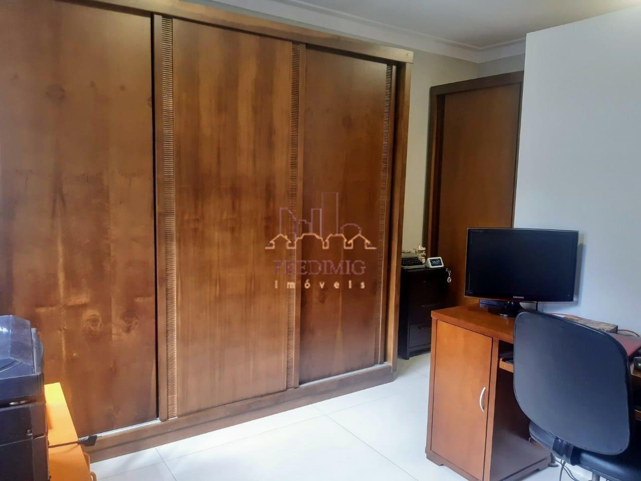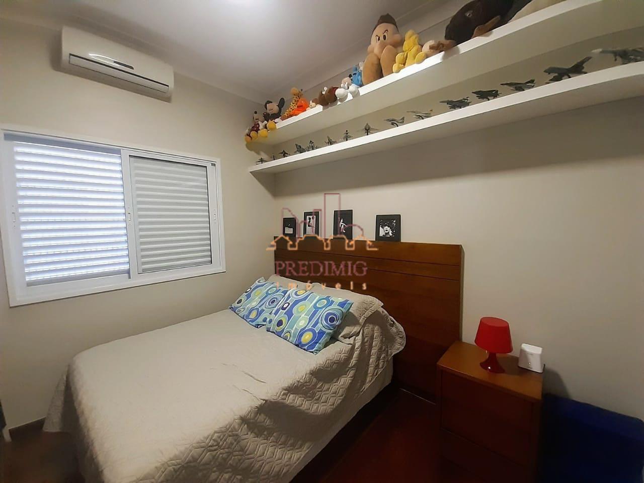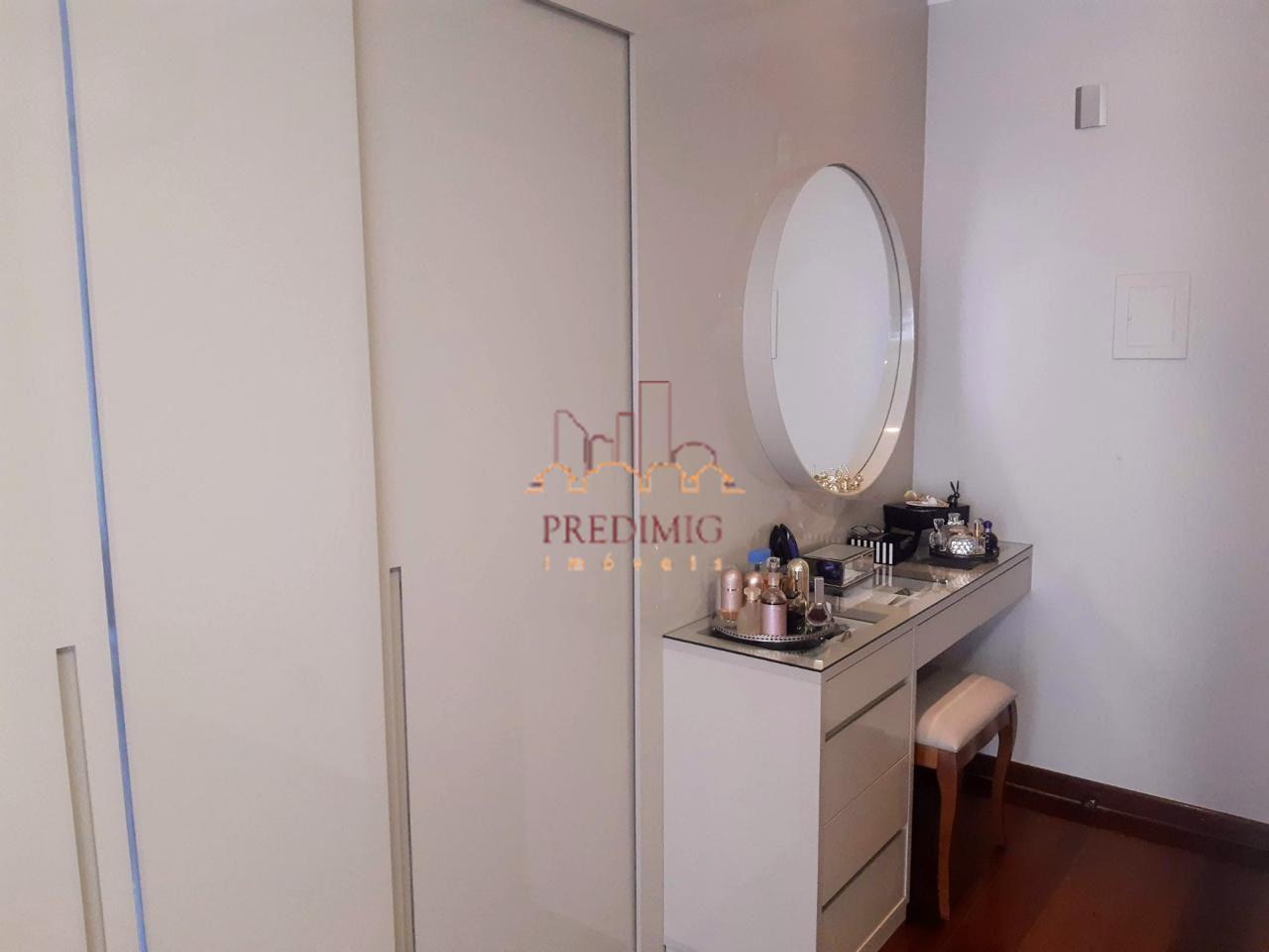 No piso superior, a suíte master conta com closet, varanda e um banheiro com banheira. No piso intermediário, são três quartos com armários, piso em tábua corrida e janelas de esquadria de alumínio. Além disso, há uma sala de cinema, uma sala de TV, um lavabo e um espaço coberto com piso de granito.
