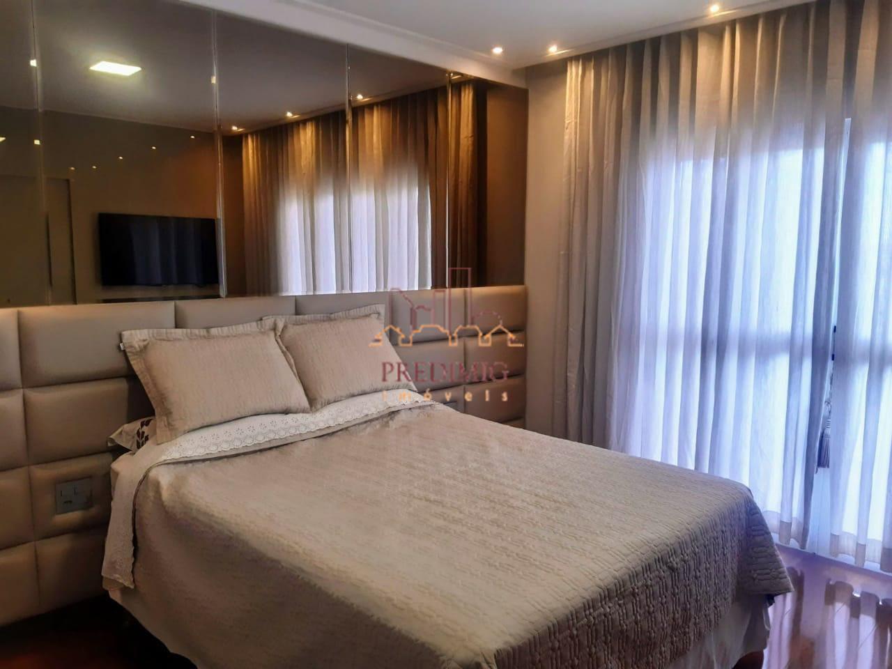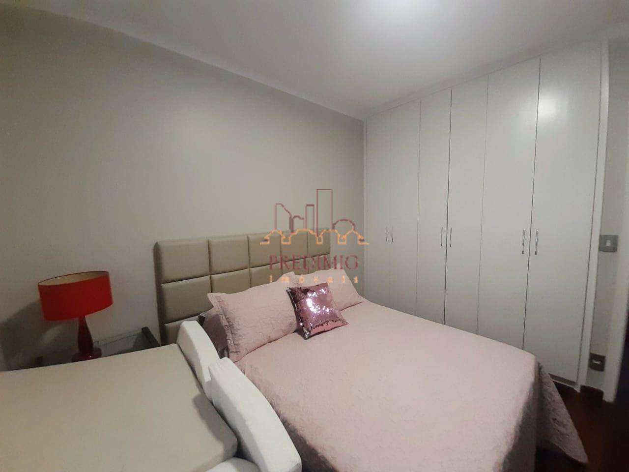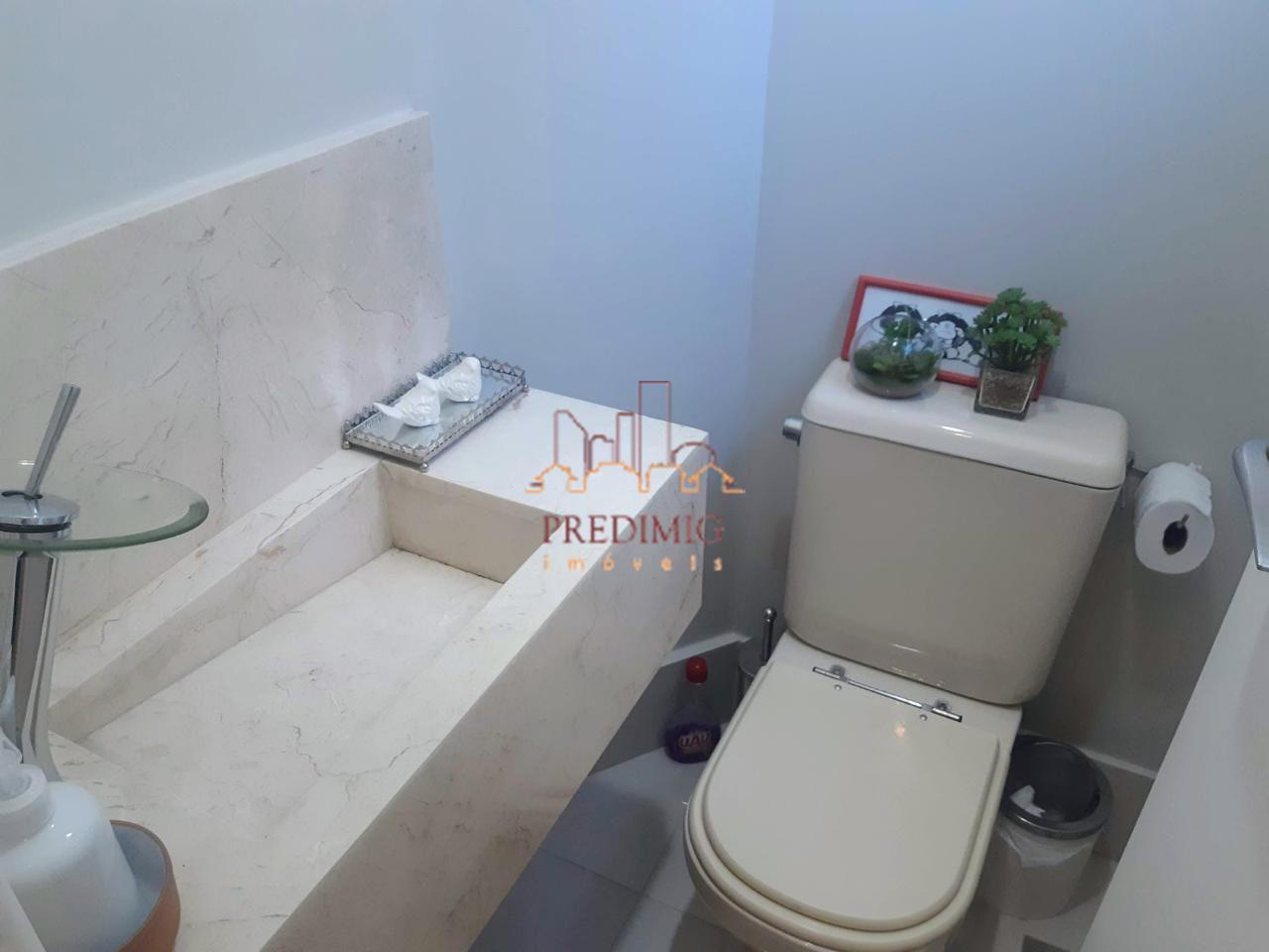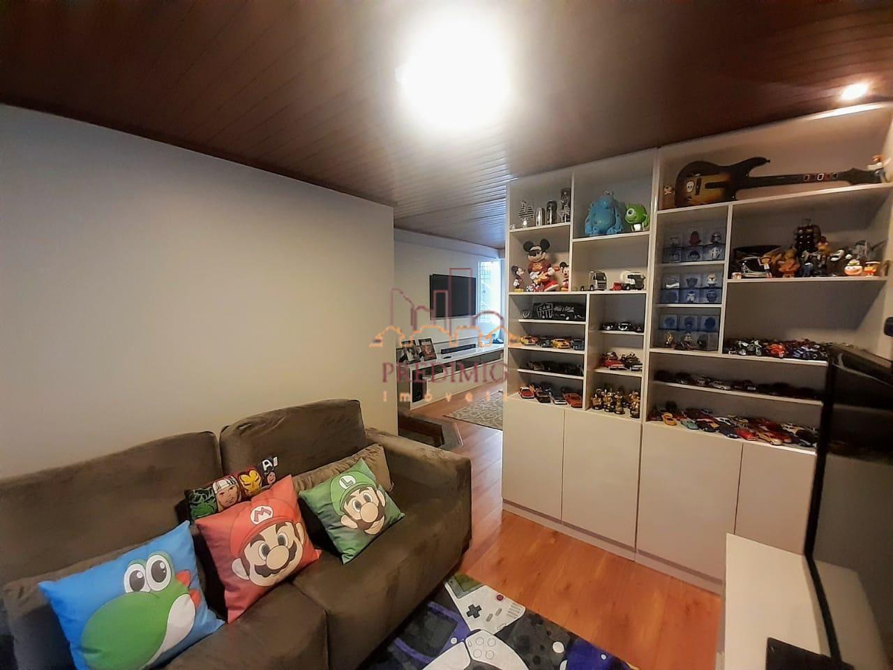No piso superior, a suíte master conta com closet, varanda e um banheiro com banheira. No piso intermediário, são três quartos com armários, piso em tábua corrida e janelas de esquadria de alumínio. Além disso, há uma sala de cinema, uma sala de TV, um lavabo e um espaço coberto com piso de granito.
