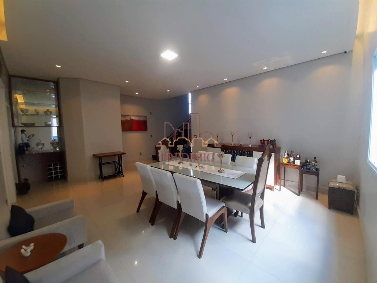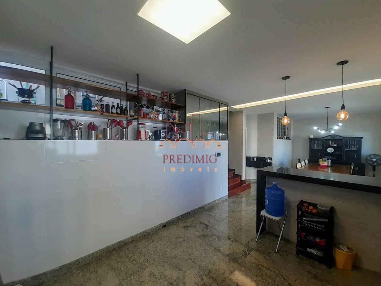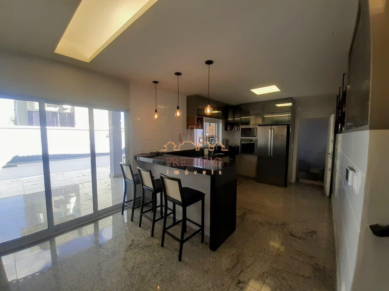 O piso inferior abriga uma cozinha ampla conjugada com a copa, equipada com armários, além de um lavabo. A varanda gourmet, com bancada e churrasqueira, integra-se à área externa, que conta com uma quadra descoberta. A área de serviço também possui armários e há espaços de depósito.