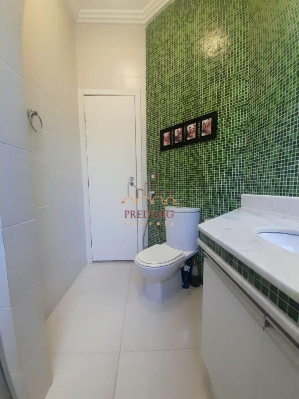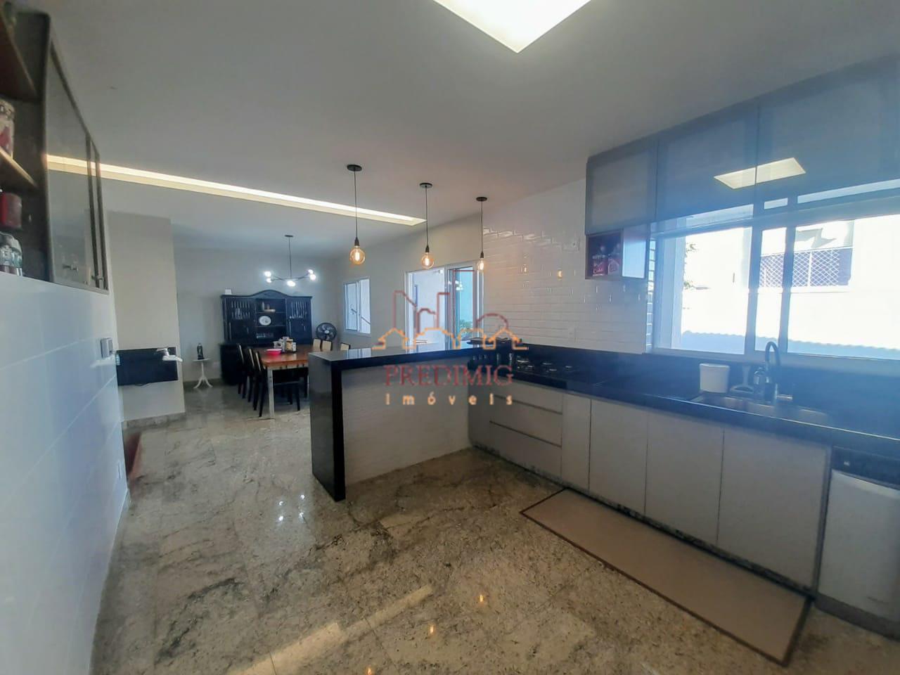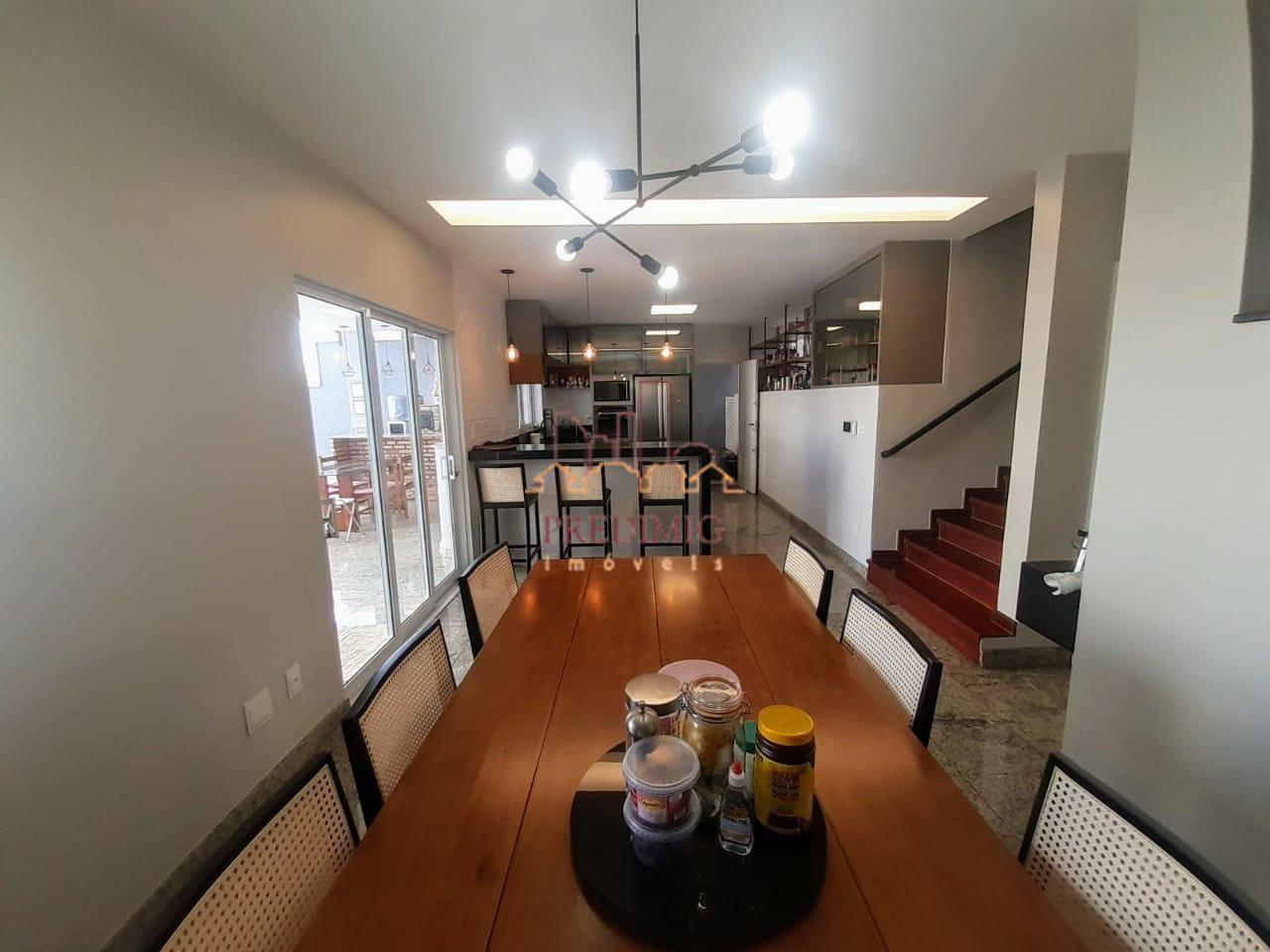 O piso inferior abriga uma cozinha ampla conjugada com a copa, equipada com armários, além de um lavabo. A varanda gourmet, com bancada e churrasqueira, integra-se à área externa, que conta com uma quadra descoberta. A área de serviço também possui armários e há espaços de depósito.