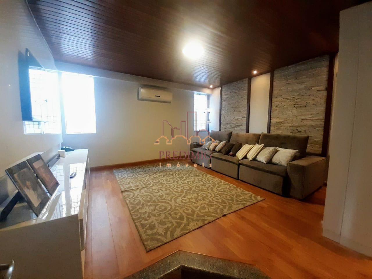 No primeiro piso, você encontra uma sala ampla com pé direito alto, um projeto de iluminação em LED e piso de porcelanato. Há também um lavabo e um escritório com armários.